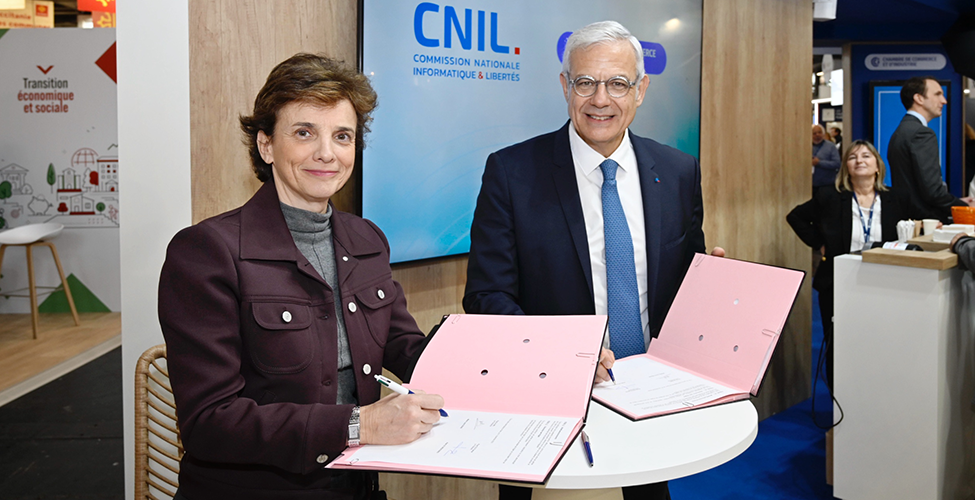 Le 21 novembre 2023, Marie-Laure Denis, présidente de la CNIL et Alain Di Crescenzo, président de CCI France, ont signé une convention de partenariat qui vise à associer leurs efforts pour accompagner les entreprises afin qu’elles puissent prendre en compte la protection des données tout en développant leurs usages du numérique et leurs innovations.