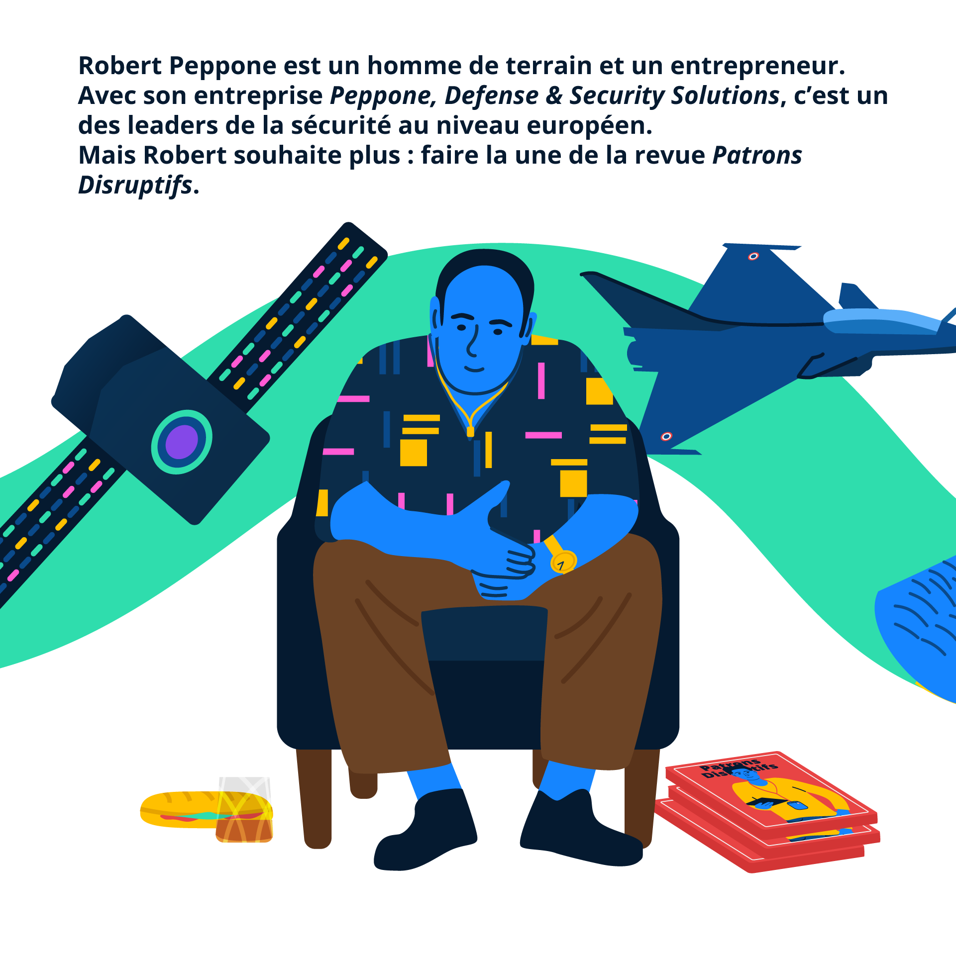 Robert Peppone est un homme d’action et de terrain. Il a créé sa propre entreprise : « Peppone, Defense & Security Solutions ». Il joue d’abord de son ancrage local, avant de se développer au niveau national puis européen. Il est un des leaders de la sécurité. Son entreprise est prospère mais Robert voudrait plus : c’est la une de la revue Patrons Disruptifs qui l’intéresse.