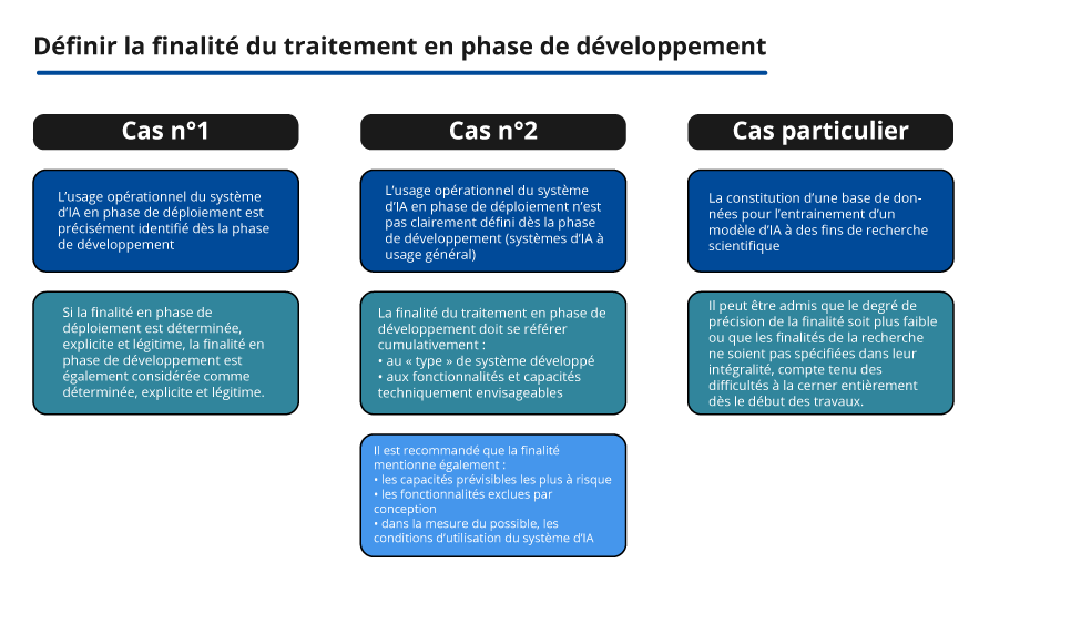 ► Si la finalité en phase de déploiement est déterminée, explicite et légitime, la finalité en phase de développement est également considérée comme déterminée, explicite et légitime.