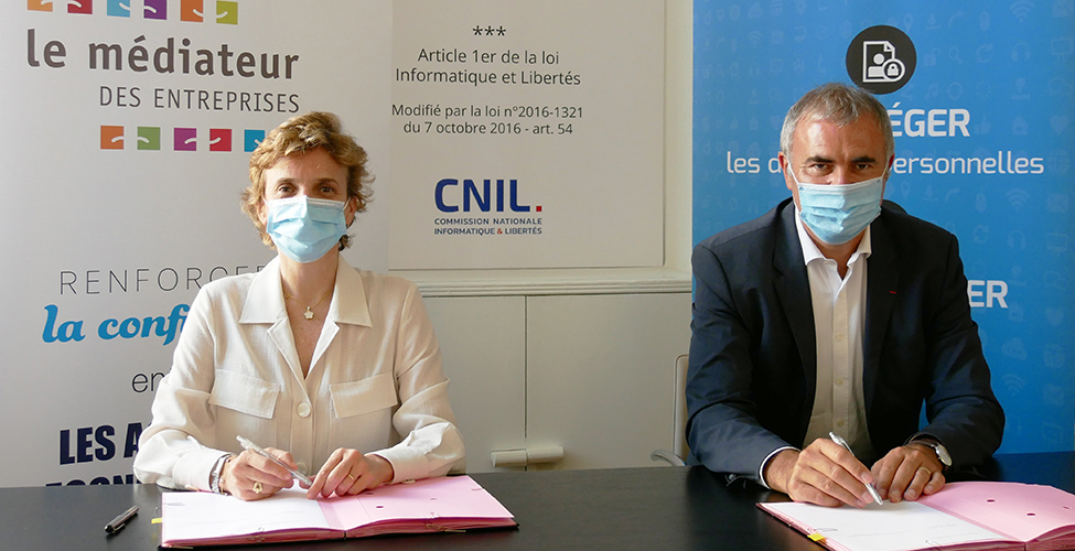Marie-Laure Denis, Présidente de la CNIL (Commission nationale informatique et libertés) et Pierre Pelouzet, Médiateur des entreprises, signent un partenariat pour 3 ans au travers d’une convention. Cette collaboration permettra d’apporter une aide aux acteurs économiques faisant face à des difficultés d’application du règlement général sur la protection des données (RGPD) dans leurs relations contractuelles, notamment dans le contexte de la COVID-19.