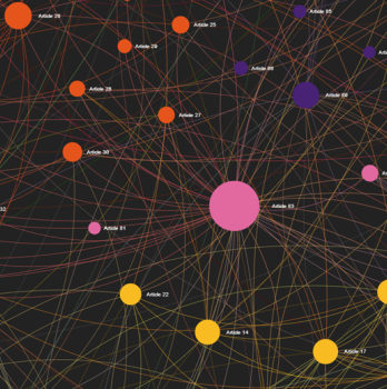 Au clic sur un article, le graphe présente les liens entre l’article sélectionné et les thèmes et les considérants liés à celui-ci. Une fenêtre permettant d’accéder au texte de l’article sélectionné s’ouvre.
