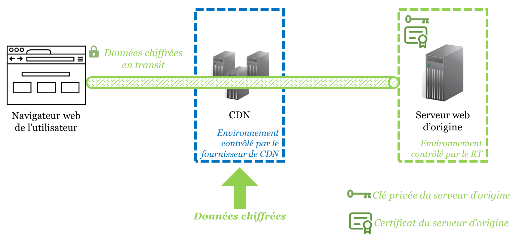 - l’intermédiaire chiffre le flux de données à l’aide des éléments cryptographiques du serveur d’origine (voir figures 3 et 5).