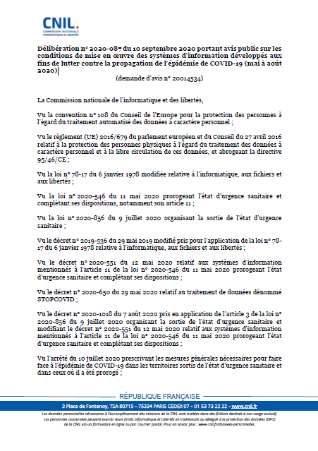 Délibération n° 2020-087 du 10 septembre 2020 portant avis public sur les conditions de mise en oeuvre des systèmes d'information développés aux fins de lutter contre la propagation de l'épidémie de COVID-19 (mai à août 2020)