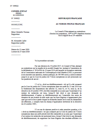 Décision du Conseil d'État du 27 mars 2020 relative au déréférencement