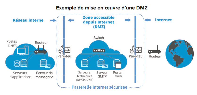- Cloisonner le réseau pour réduire l’impact en cas de compromission. On peut au minimum distinguer un réseau interne sur lequel aucune connexion venant d’Internet n’est autorisée et un réseau DMZ (« demilitarized zone ») accessible depuis Internet, en les séparant par des passerelles (« gateway »).