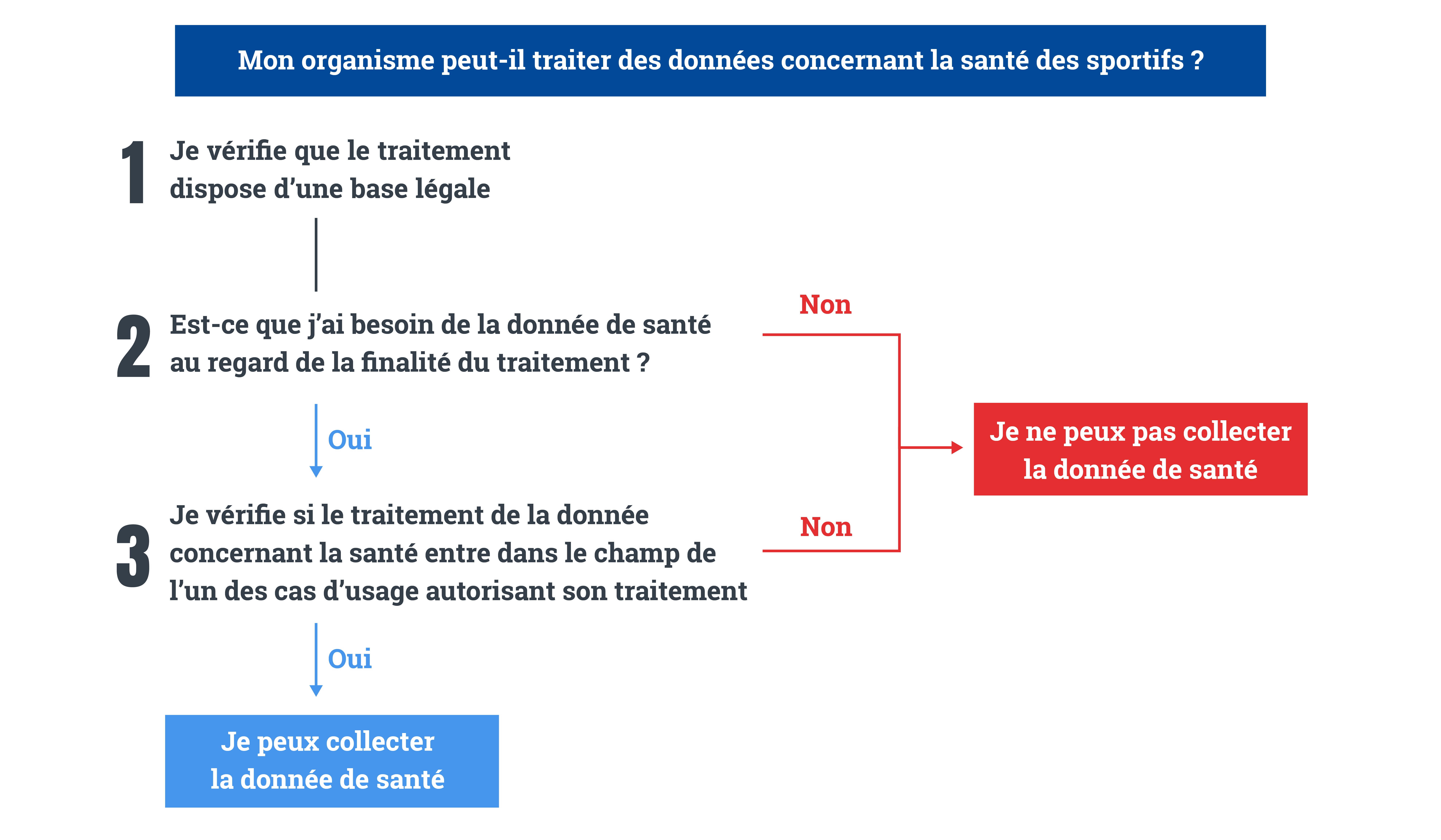 Exemple : concernant les ligues professionnelles, l’article A. 231-5 du code du sport prévoit, qu’au plus tard dans les deux mois suivant l’embauche des sportifs professionnels salariés, puis annuellement, ceux-ci se soumettent à des examens médicaux réalisés par un médecin du sport notamment examen clinique, bilan diététique et psychologique, électrocardiogramme. Attention, dans cette hypothèse, le traitement des données générées par le suivi médical des sportifs concernés doit être expressément autorisé par le droit de l’Union, par le droit français ou par une convention collective.
