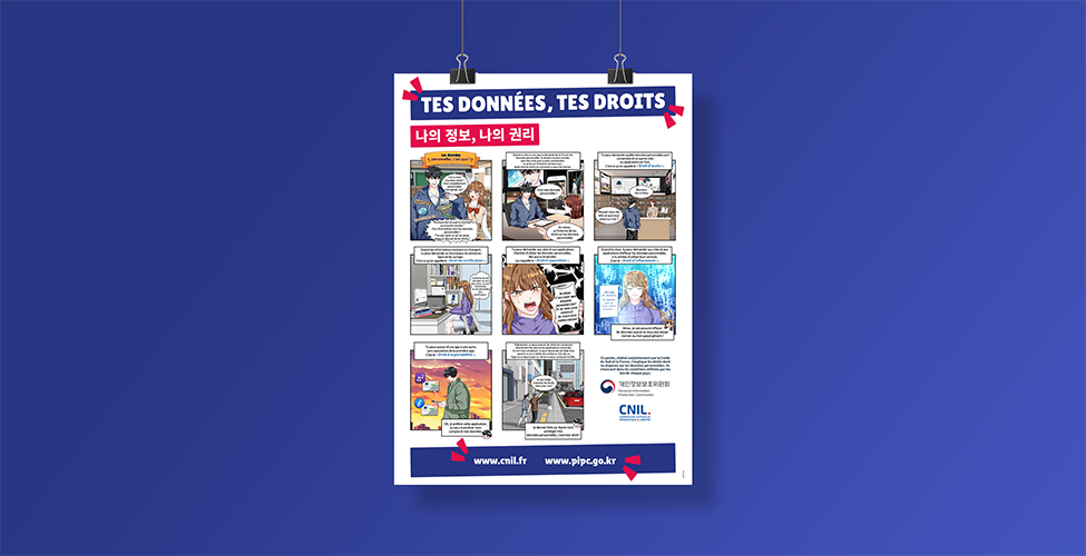 Dans le cadre du partenariat entre la CNIL et la PIPC (autorité de protection des données de la Corée du Sud) mis en place en 2022, l’affiche « Tes données, tes droits » réalisée dans le style manhwa vise à informer les jeunes de ce qu’ils peuvent faire pour protéger leur vie privée en ligne
