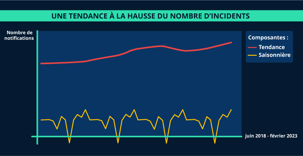 Note : la tendance est la moyenne glissante du nombre de notifications reçues par la CNIL corrigée des séries issues d’un même incident.