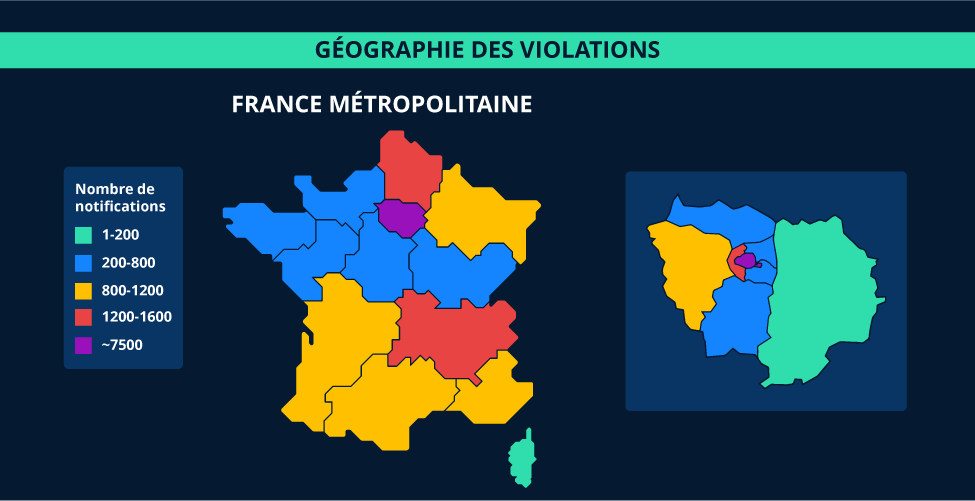 Afin de comprendre cette répartition, il convient de prendre en compte que la notification est faite par le responsable de traitement, même si l’incident à l’origine de la violation s’est produit dans un établissement secondaire, géographiquement distant. Ainsi, cette répartition géographique correspond à la densité économique du territoire, en particulier la densité des sièges sociaux. Elle ne permet donc pas de tirer de conclusions sur des menaces ou tendances particulières.