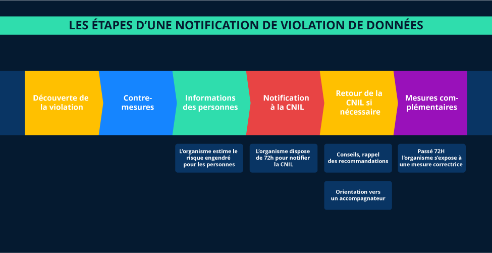 En cas de violation de données personnelles, le responsable de traitement notifie la violation en question à l’autorité de contrôle compétente dans les meilleurs délais, et si possible, 72 heures au plus tard après en avoir pris connaissance (article 33.1 du RGPD). Lorsque la notification à l’autorité de contrôle n’a pas lieu dans les 72 heures, elle doit être accompagnée des motifs du retard.